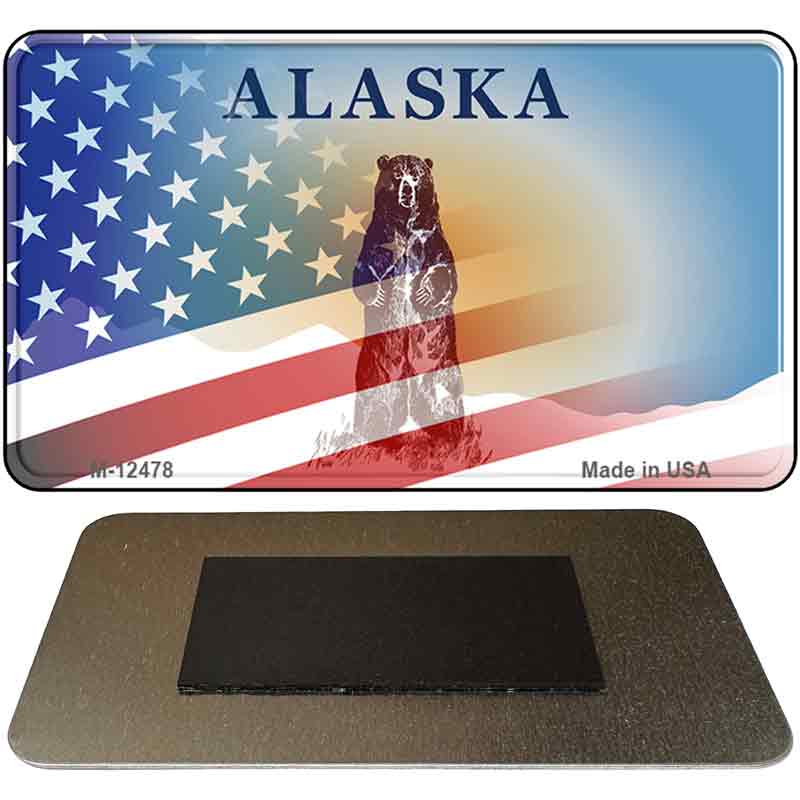Alaska with American Flag Novelty Metal Magnet M-12478. 3.5" x 2" high gloss metal with magnet on the back. Made of the highest quality aluminum for a weather resistant finish. It is lightweight and durable. Proudly made in the USA.
