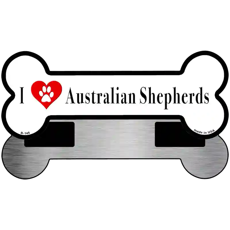 I Love Australian Shepherds Novelty Metal Bone Magnet B-145.3.5" x 9" High gloss metal novelty Bone Sign Magnets. Made of the highest quality aluminum for a weather resistant finish. It is lightweight and durable. Equipped with two magnets on the back of the plate. Individually shrink-wrapped and proudly made in the USA. Most orders ship within 24-48 hours.