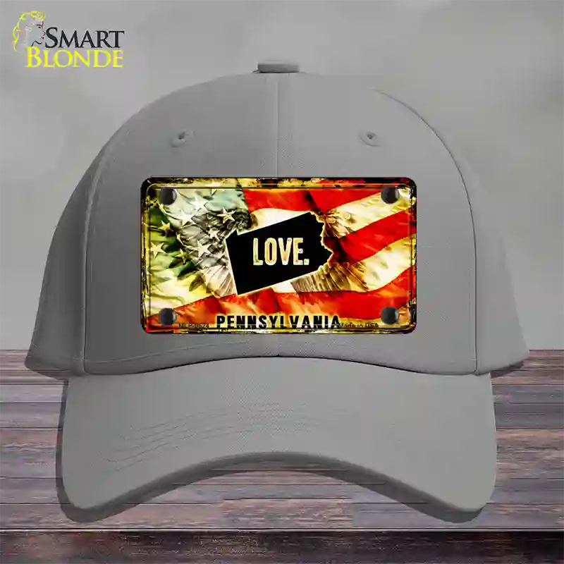 Pennsylvania Love Novelty License Plate Hat. Show off your style with our mounted 4" x 2.2" metal patches available in 3 different styles and over 12 different colors. Our metal patches are made out of .025 grade aluminum and the designs are dye sublimated onto the metal to give a quality high gloss finish. Our metal patches are firmly attached using double cap rivets to give the patch an elegant tight fitting look!