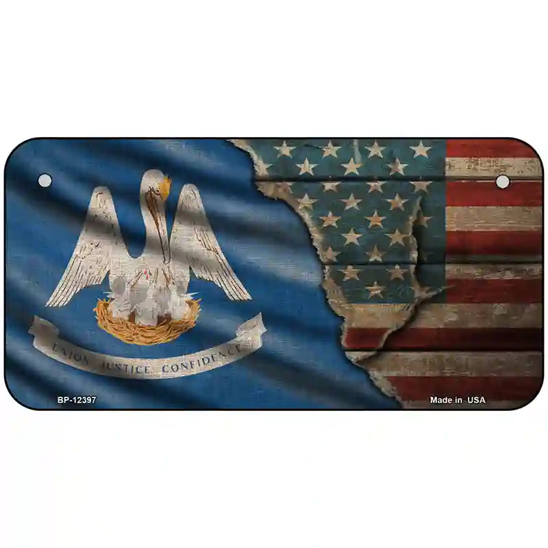 Louisiana/American Flag Novelty Metal License Plate. Offering our unique license plate designs in a 12" Standard Automotive License Plate, 7" Motorcycle/ATV Plate, 6" Bike Plate, 4" Miniature License Plate and 24" large license plate garage sign. The 12" x 6" License Plate is made out of a .032 grade aluminum and the other sizes are made out of a .025 grade aluminum, which make them lightweight and durable. All license plates will have pre-drilled holes making these decorative license plates easy to display. Choose between the sizes offered or add all to your cart to show off your design in different ways. These items are proudly made here in the USA. Check out our other different sizes with the same artwork on them in our Key Chains, Rectangle Magnets, Dog Tag Necklaces, and Hat Pins.