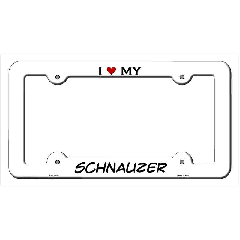 Schnauzer Novelty Metal License Plate Frame LPF-219. Instantly personalize your car with our automotive high gloss molded metal license plate frame. Frames fit standard 6" x 12" license plate tags, individually shrink-wrapped and proudly made in the USA.