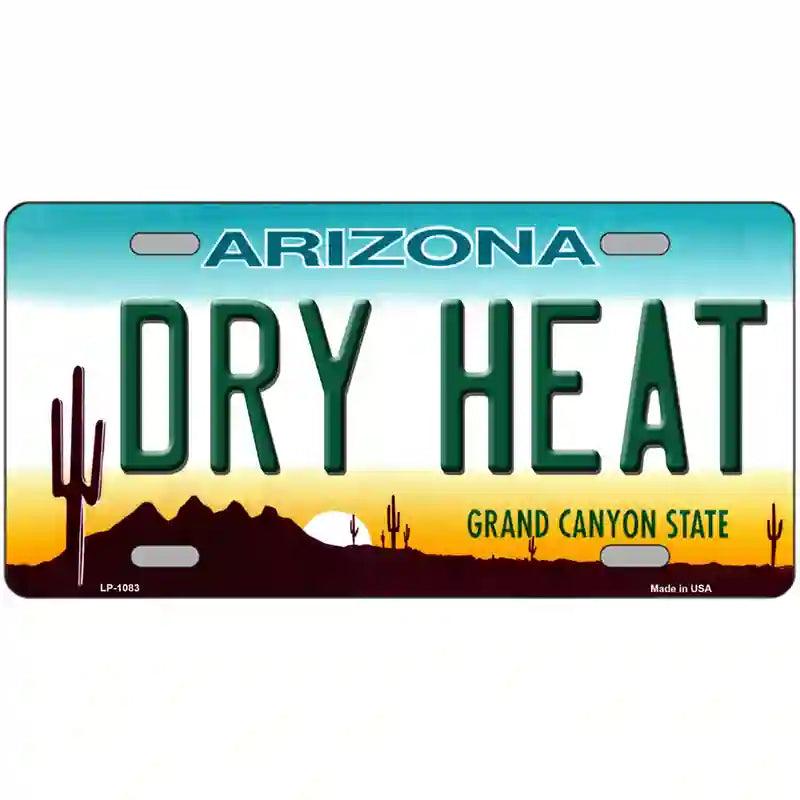 Dry Heat Arizona Novelty Metal License Plate. Offering our unique license plate designs in a 12" Standard Automotive License Plate, 7" Motorcycle/ATV Plate, 6" Bike Plate, 4" Miniature License Plate and 24" large license plate garage sign. The 12" x 6" License Plate is made out of a .032 grade aluminum and the other sizes are made out of a .025 grade aluminum, which make them lightweight and durable. All license plates will have pre-drilled holes making these decorative license plates easy to display. Choose between the sizes offered or add all to your cart to show off your design in different ways. These items are proudly made here in the USA. Check out our other different sizes with the same artwork on them in our Key Chains, Rectangle Magnets, Dog Tag Necklaces, and Hat Pins.