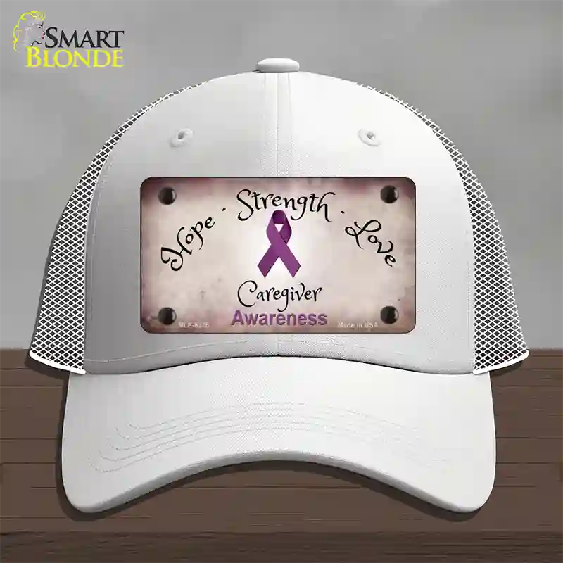 Honors Caregivers Ribbon Novelty License Plate Hat. Show off your style with our mounted 4" x 2.2" metal patches available in 3 different styles and over 12 different colors. Our metal patches are made out of .025 grade aluminum and the designs are dye sublimated onto the metal to give a quality high gloss finish. Our metal patches are firmly attached using double cap rivets to give the patch an elegant tight fitting look!