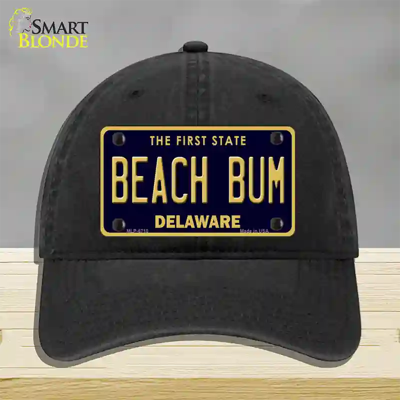 Beach Bum Delaware Novelty License Plate Hat. Show off your style with our mounted 4" x 2.2" metal patches available in 3 different styles and over 12 different colors. Our metal patches are made out of .025 grade aluminum and the designs are dye sublimated onto the metal to give a quality high gloss finish. Our metal patches are firmly attached using double cap rivets to give the patch an elegant tight fitting look!