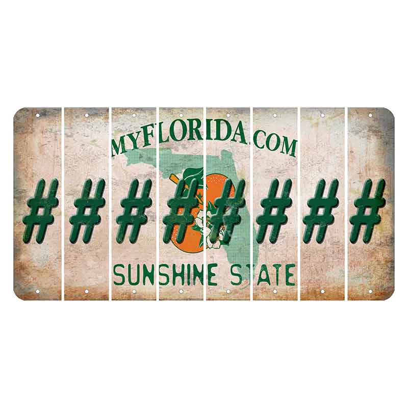 Florida Orange Blossom Cut License Plate Strips (Set of 8). 6 x 1.5 Set of 8 Florida Cut License Plate Strips. With over 250 different letters, numbers, symbols and add-ons to help any wood sign or bookmark be completely unique and a great gift! Offering different state backgrounds to further expand the support of Florida and its history in license plates. Made of the highest quality aluminum for a weather resistant finish. It is lightweight & durable. Each pack of 8 is shrink-wrapped and proudly made in the USA.