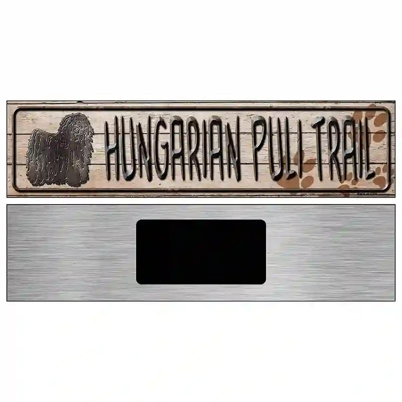 Hungarian Puli Trail Novelty Metal Street Sign. Offering our unique novelty designs in a 24" Street Sign, 18" Small Street Sign, 12" Mini Street Sign, 6" Street Sign Magnet and a 19.5" Wood Mounted Small Street Sign. All products are made out of .025 grade aluminum, which make them lightweight and durable. All signs will have pre-drilled holes to make hanging these decorative signs easier. Choose between the sizes offered or add all to your cart to show off your style. The wood mounted street sign is mounted using 2 decorative nails and is on a lightweight woodboard for easy hanging. These items are proudly made here in the USA.