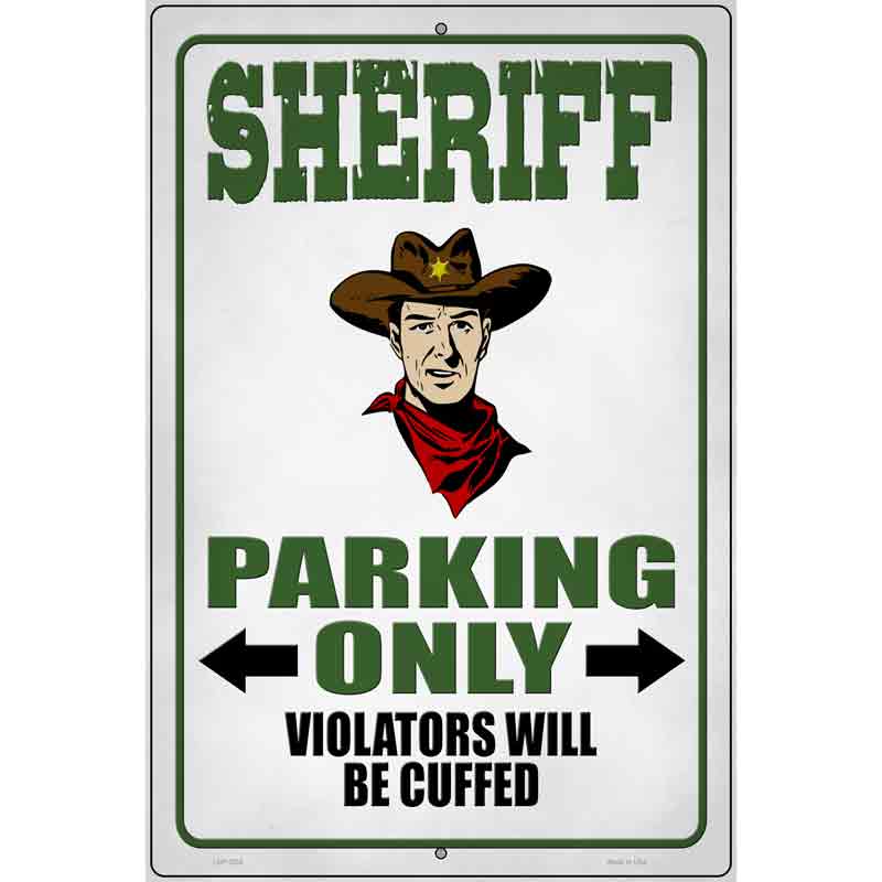 Sheriff Parking Only Novelty Metal Parking Sign. Offering our unique novelty designs in a 12" x 18" Large Parking Sign, 9" x 12" Small Parking Sign and a 4.5" x 6" Mini Parking Sign. All products are made out of .025 grade aluminum, which make them lightweight and durable. All signs will have pre-drilled holes to make hanging these decorative signs easier. Choose between the sizes offered or add both to your cart to show off your style and decorations anywhere! These items are proudly made here in the USA.