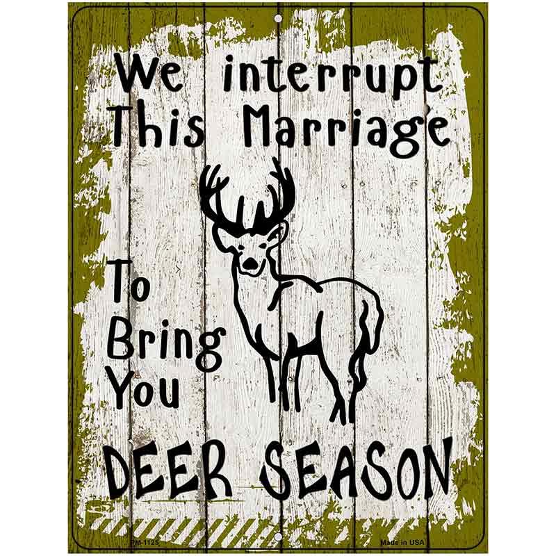 Interrupt Marriage Deer Season Metal Novelty Parking Sign. Offering our unique novelty designs in a 12" x 18" Large Parking Sign, 9" x 12" Small Parking Sign and a 4.5" x 6" Mini Parking Sign. All products are made out of .025 grade aluminum, which make them lightweight and durable. All signs will have pre-drilled holes to make hanging these decorative signs easier. Choose between the sizes offered or add both to your cart to show off your style and decorations anywhere! These items are proudly made here in the USA.