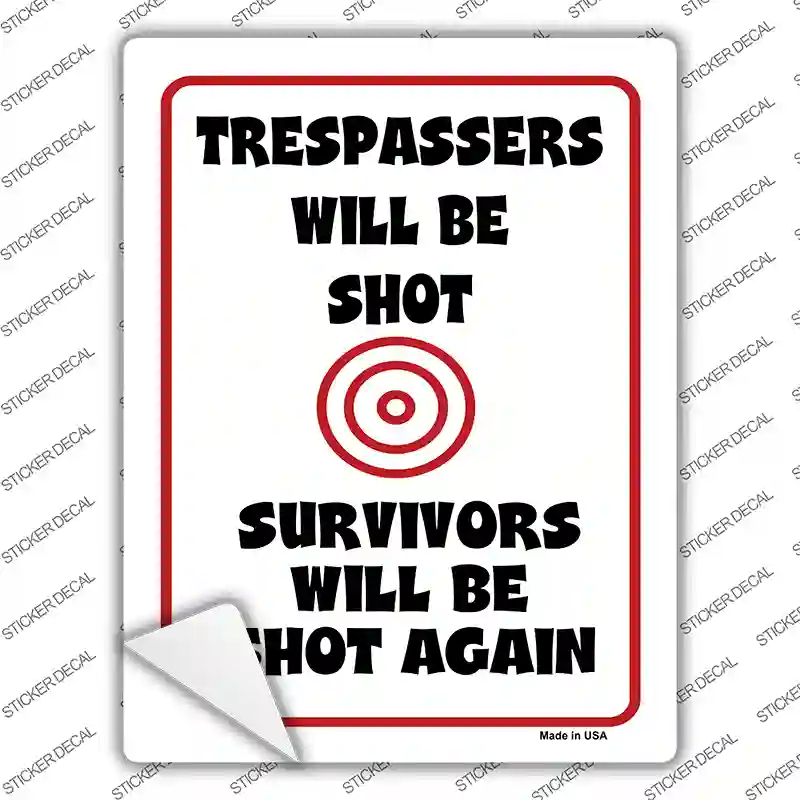 Trespassers Will Be Shot Target Novelty Rectangle Sticker Decal. Rectangle Shaped sticker decal. With over 30,000 unique designs, our stickers are water resistant and great for use on cars, windows, water bottles, laptops, hardhats, toolboxes and much more. Every sticker is printed on high quality 6 mil sticker paper, and are individually cut out. All designs are available as 3", 6", 9" and 12" stickers. Most orders ship out within 24-48 hours.
