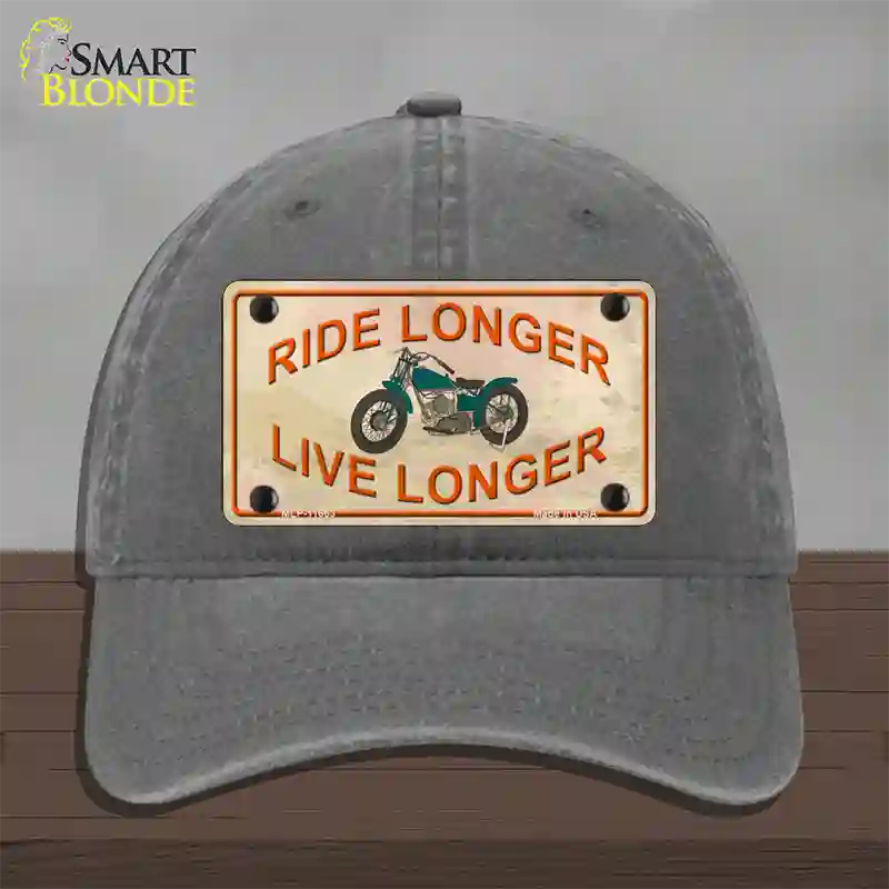 Ride Longer Live Longer Novelty License Plate Hat. Show off your style with our mounted 4" x 2.2" metal patches available in 3 different styles and over 12 different colors. Our metal patches are made out of .025 grade aluminum and the designs are dye sublimated onto the metal to give a quality high gloss finish. Our metal patches are firmly attached using double cap rivets to give the patch an elegant tight fitting look!