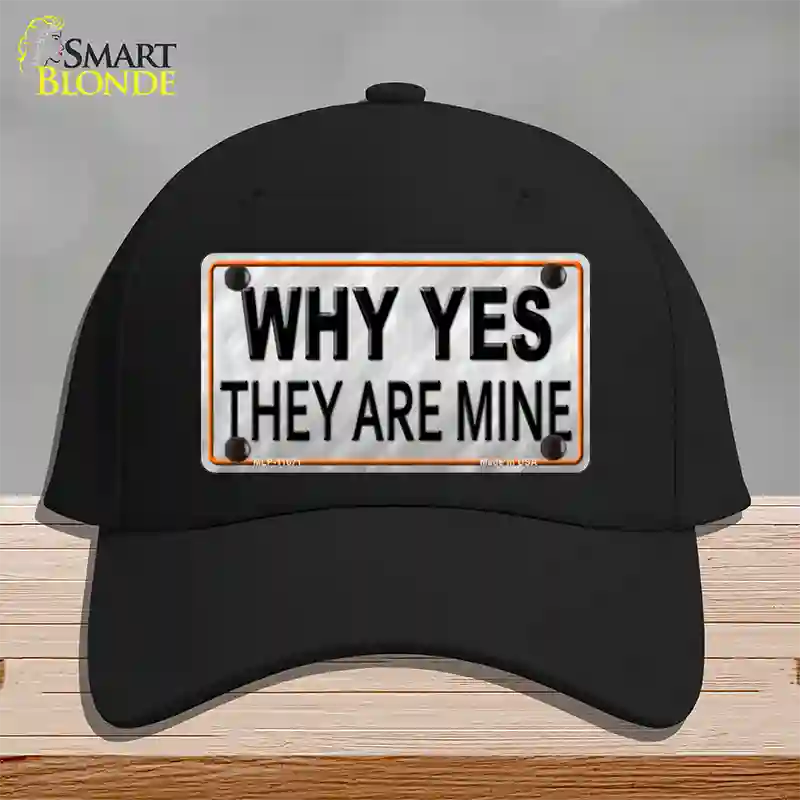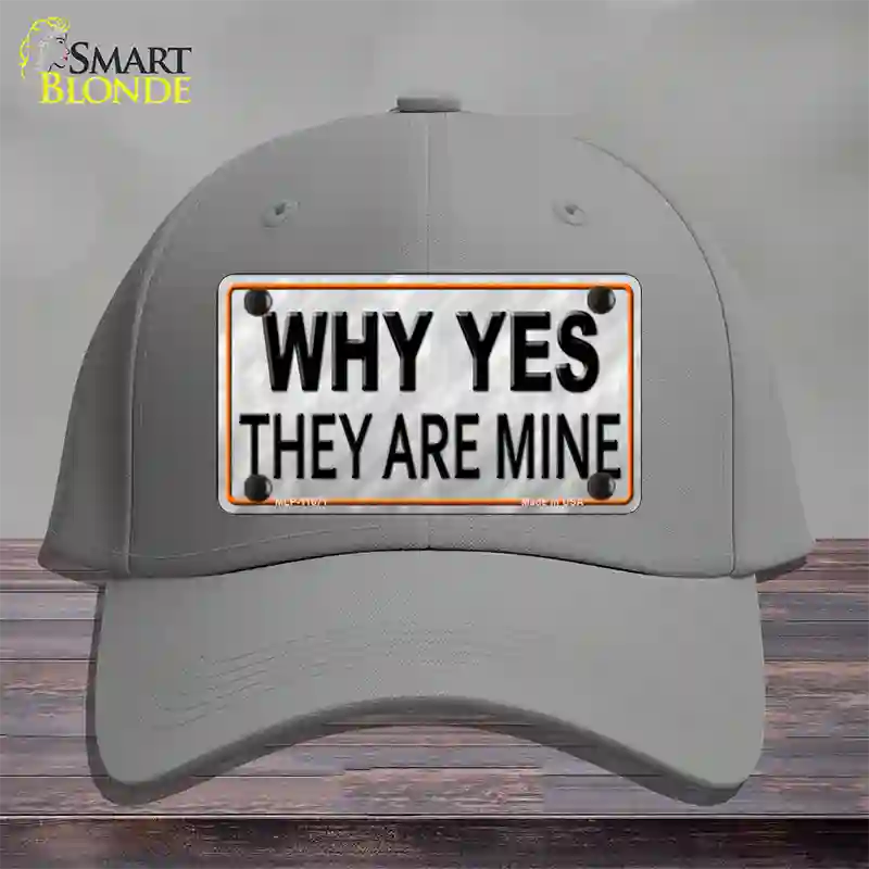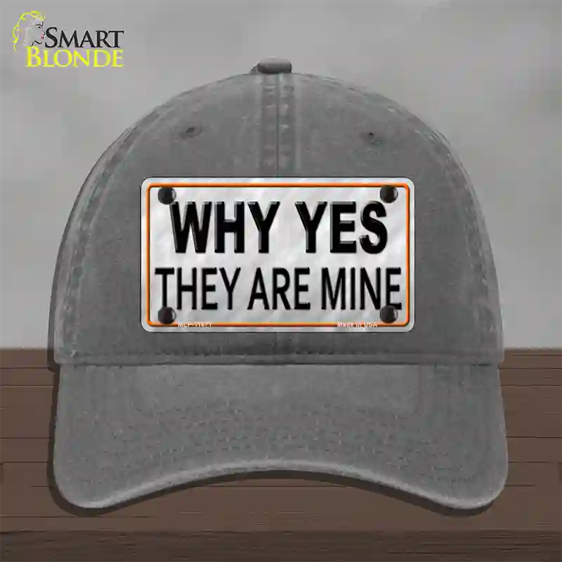 Why Yes They Are Mine Novelty License Plate Hat. Show off your style with our mounted 4" x 2.2" metal patches available in 3 different styles and over 12 different colors. Our metal patches are made out of .025 grade aluminum and the designs are dye sublimated onto the metal to give a quality high gloss finish. Our metal patches are firmly attached using double cap rivets to give the patch an elegant tight fitting look!