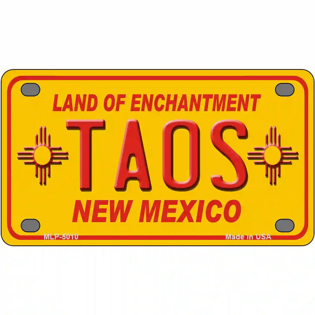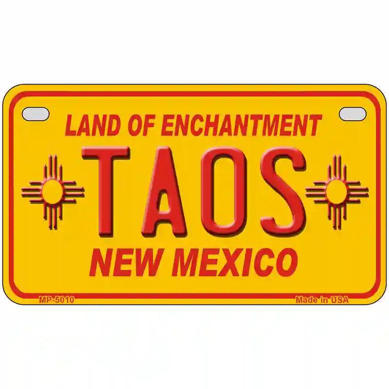 Taos Yellow New Mexico Novelty License Plate. Offering our unique license plate designs in a 12" Standard Automotive License Plate, 7" Motorcycle/ATV Plate, 6" Bike Plate, 4" Miniature License Plate and 24" large license plate garage sign. The 12" x 6" License Plate is made out of a .032 grade aluminum and the other sizes are made out of a .025 grade aluminum, which make them lightweight and durable. All license plates will have pre-drilled holes making these decorative license plates easy to display. Choose between the sizes offered or add all to your cart to show off your design in different ways. These items are proudly made here in the USA. Check out our other different sizes with the same artwork on them in our Key Chains, Rectangle Magnets, Dog Tag Necklaces, and Hat Pins.