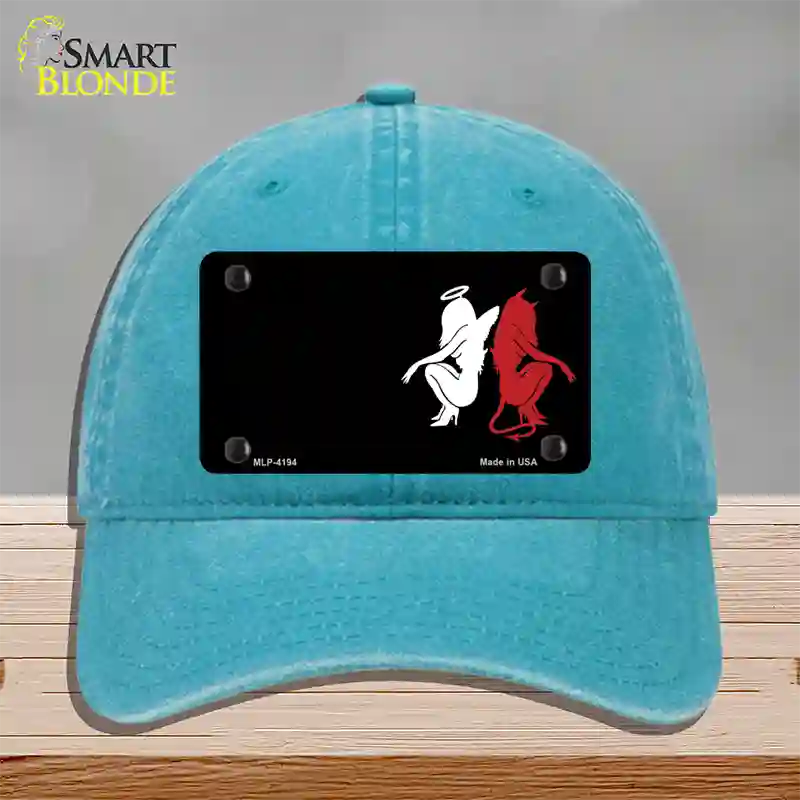 Angel Devil Offset Novelty License Plate Hat. Show off your style with our mounted 4" x 2.2" metal patches available in 3 different styles and over 12 different colors. Our metal patches are made out of .025 grade aluminum and the designs are dye sublimated onto the metal to give a quality high gloss finish. Our metal patches are firmly attached using double cap rivets to give the patch an elegant tight fitting look!