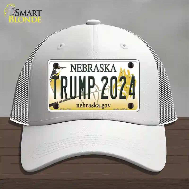 Trump 2024 Nebraska Novelty License Plate Hat. Show off your style with our mounted 4" x 2.2" metal patches available in 3 different styles and over 12 different colors. Our metal patches are made out of .025 grade aluminum and the designs are dye sublimated onto the metal to give a quality high gloss finish. Our metal patches are firmly attached using double cap rivets to give the patch an elegant tight fitting look!
