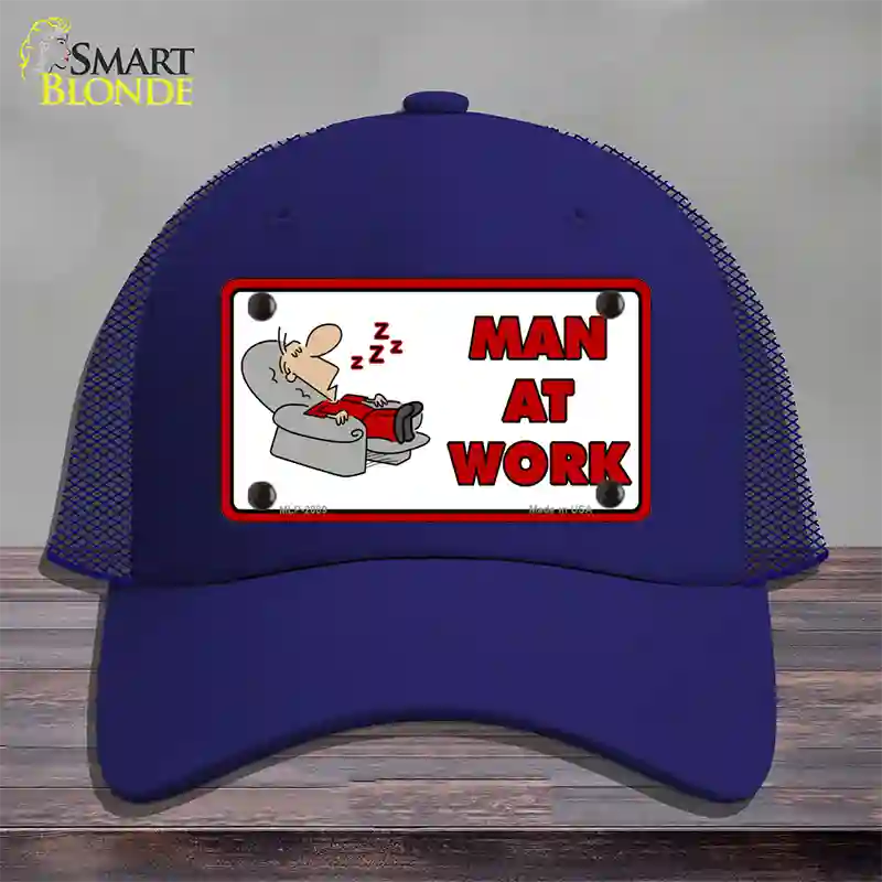 Man At Work Novelty License Plate Hat. Show off your style with our mounted 4" x 2.2" metal patches available in 3 different styles and over 12 different colors. Our metal patches are made out of .025 grade aluminum and the designs are dye sublimated onto the metal to give a quality high gloss finish. Our metal patches are firmly attached using double cap rivets to give the patch an elegant tight fitting look!
