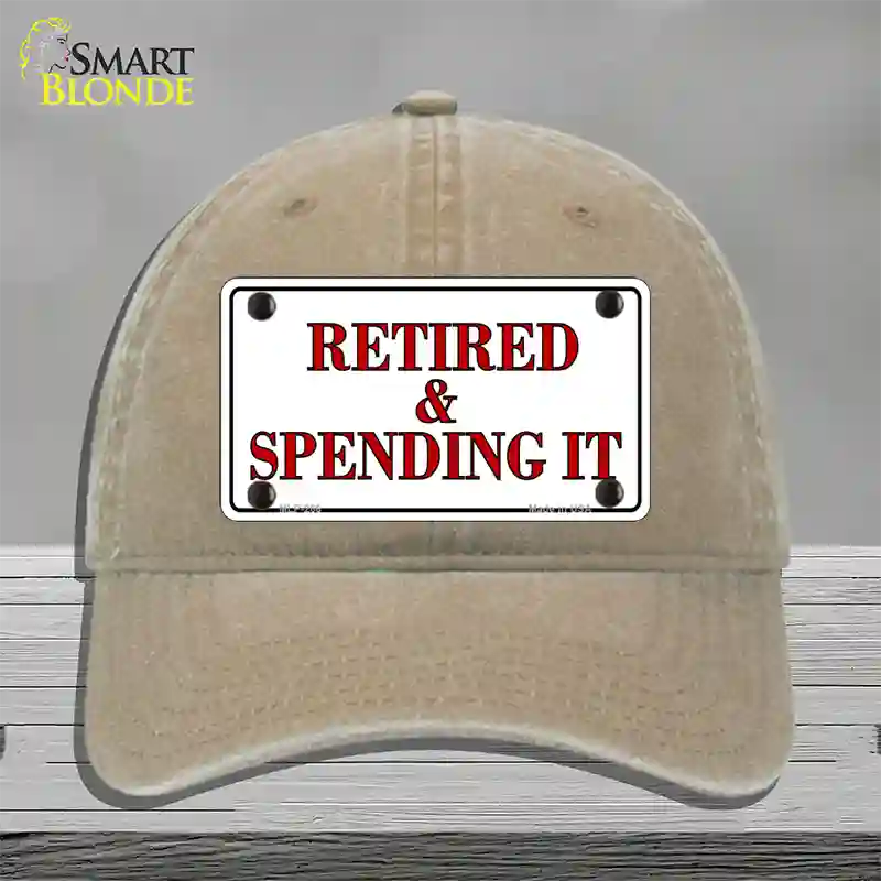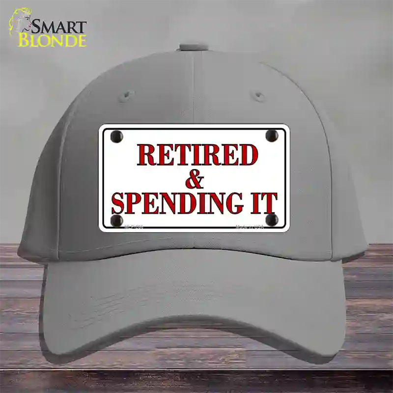 Retired And Spending It Novelty License Plate Hat. Show off your style with our mounted 4" x 2.2" metal patches available in 3 different styles and over 12 different colors. Our metal patches are made out of .025 grade aluminum and the designs are dye sublimated onto the metal to give a quality high gloss finish. Our metal patches are firmly attached using double cap rivets to give the patch an elegant tight fitting look!