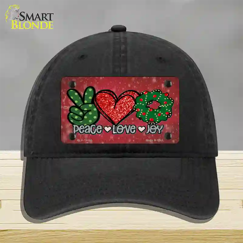 Peace Love Joy Novelty License Plate Hat. Show off your style with our mounted 4" x 2.2" metal patches available in 3 different styles and over 12 different colors. Our metal patches are made out of .025 grade aluminum and the designs are dye sublimated onto the metal to give a quality high gloss finish. Our metal patches are firmly attached using double cap rivets to give the patch an elegant tight fitting look!