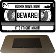 Beware! Horror Movie Night, Its Fright Night! Novelty Metal Magnet M-14536. 3.5" x 2" high gloss metal with magnet on the back. Made of the highest quality aluminum for a weather resistant finish. It is lightweight and durable. Proudly made in the USA.