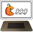 Pac-Man Themed Pumpkin Chasing Ghosts Novelty Metal Magnet M-14545. 3.5" x 2" high gloss metal with magnet on the back. Made of the highest quality aluminum for a weather resistant finish. It is lightweight and durable. Proudly made in the USA.