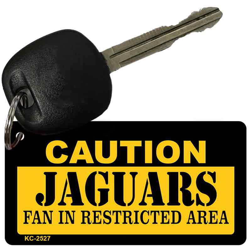 Caution Jaguars Fan Area Novelty Metal Key Chain KC-2527. 2.25" x 1.125" Key Chain. Made of the highest quality aluminum for a weather resistant finish. It is lightweight and durable. Individually shrink-wrapped and proudly made in the USA.