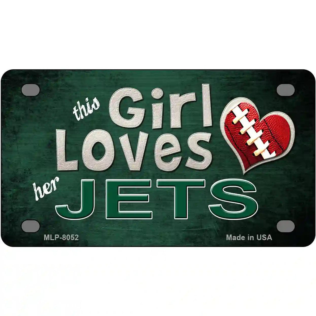 This Girl Loves Her Jets Novelty Metal License Plate. Offering our unique license plate designs in a 12" Standard Automotive License Plate, 7" Motorcycle/ATV Plate, 6" Bike Plate, 4" Miniature License Plate and 24" large license plate garage sign. The 12" x 6" License Plate is made out of a .032 grade aluminum and the other sizes are made out of a .025 grade aluminum, which make them lightweight and durable. All license plates will have pre-drilled holes making these decorative license plates easy to display. Choose between the sizes offered or add all to your cart to show off your design in different ways. These items are proudly made here in the USA. Check out our other different sizes with the same artwork on them in our Key Chains, Rectangle Magnets, Dog Tag Necklaces, and Hat Pins.