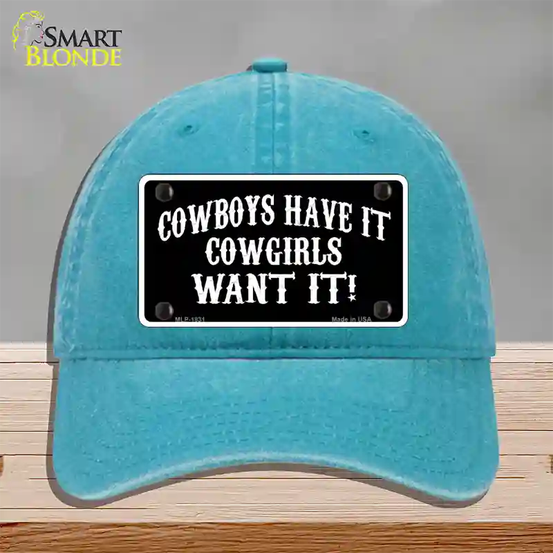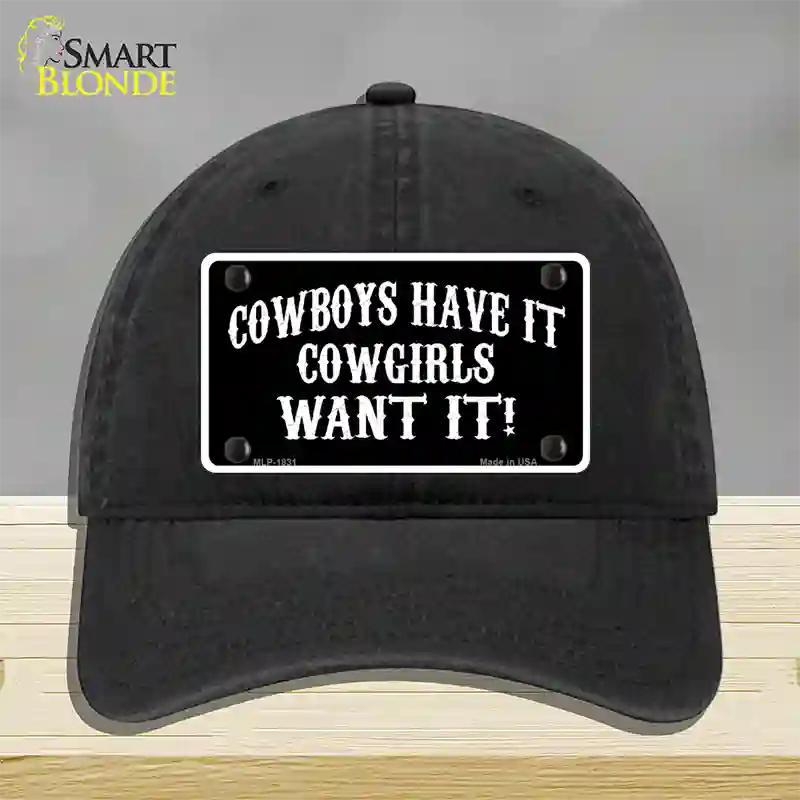 Cowboys Have It Novelty License Plate Hat. Show off your style with our mounted 4" x 2.2" metal patches available in 3 different styles and over 12 different colors. Our metal patches are made out of .025 grade aluminum and the designs are dye sublimated onto the metal to give a quality high gloss finish. Our metal patches are firmly attached using double cap rivets to give the patch an elegant tight fitting look!