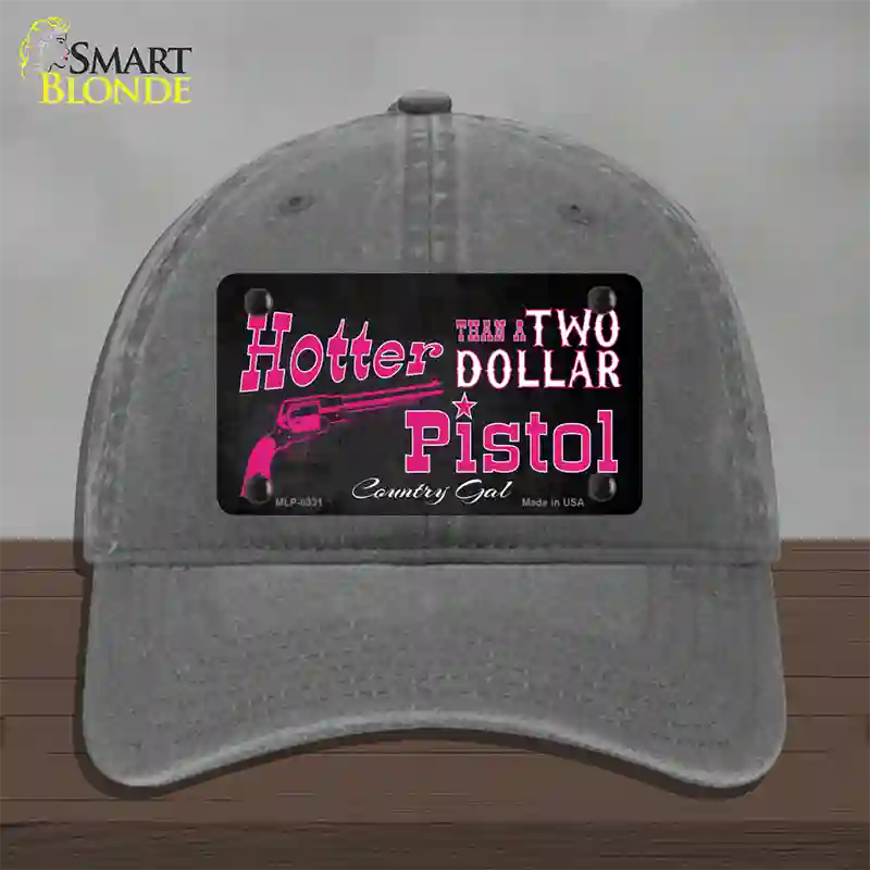 Two Dollar Pistol Novelty License Plate Hat. Show off your style with our mounted 4" x 2.2" metal patches available in 3 different styles and over 12 different colors. Our metal patches are made out of .025 grade aluminum and the designs are dye sublimated onto the metal to give a quality high gloss finish. Our metal patches are firmly attached using double cap rivets to give the patch an elegant tight fitting look!