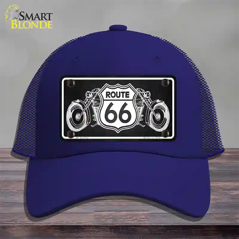 Route 66 With Bikes Novelty License Plate Hat. Show off your style with our mounted 4" x 2.2" metal patches available in 3 different styles and over 12 different colors. Our metal patches are made out of .025 grade aluminum and the designs are dye sublimated onto the metal to give a quality high gloss finish. Our metal patches are firmly attached using double cap rivets to give the patch an elegant tight fitting look!