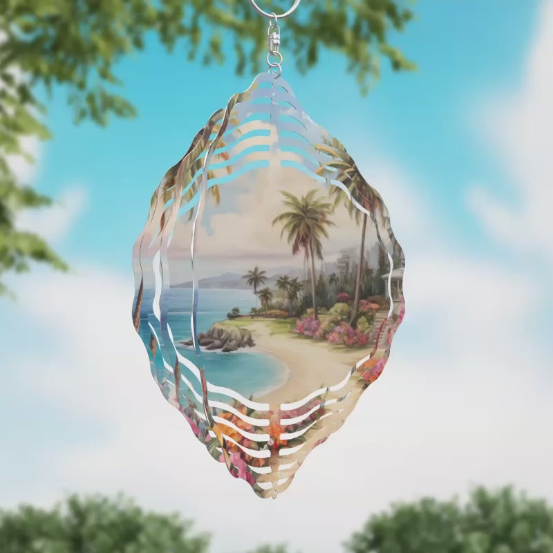 Transform your outdoor space into a serene tropical escape with our "Tropical Path on Beach" 10-Inch Wind Spinner. This exquisite decoration features a stunning beach scene, beautifully printed on both sides to ensure a mesmerizing view from every angle.