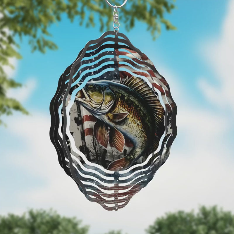 American Bass Novelty Metal Wind Spinner WCS-206. 10" Metal Wind Spinner. Made of the highest quality aluminum for a weather-resistant and long-lasting finish. Its lightweight yet durable design makes it perfect for both indoor and outdoor use. Features a dynamic 3D spinning effect that comes to life with the slightest breeze. Pre-drilled holes ensure quick and easy hanging. Add a hook, chain, or string to instantly display your windspinner. Individually shrink-wrapped for protection and proudly made in the USA.
