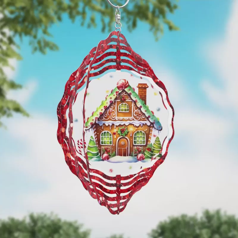 Gingerbread House in Red Glitter Wreath Novelty Metal Wind Spinner