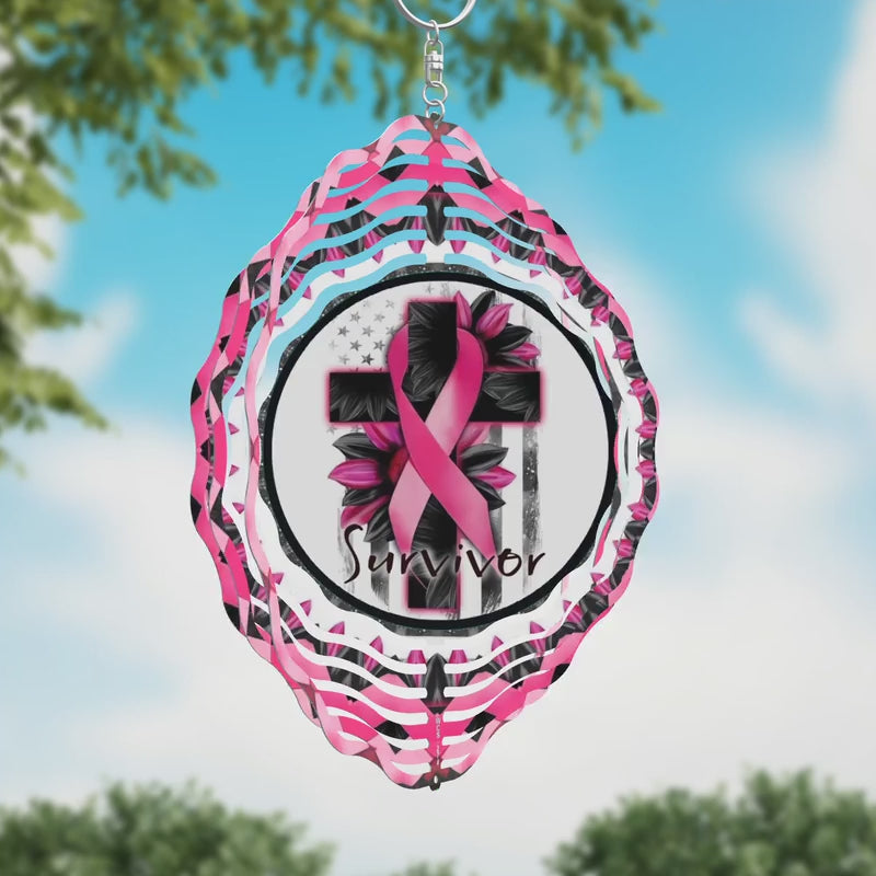 Breast Cancer Survivor Novelty Metal Wind Spinner WCS-274. 10" Metal Wind Spinner. Made of the highest quality aluminum for a weather-resistant and long-lasting finish. Its lightweight yet durable design makes it perfect for both indoor and outdoor use. Features a dynamic 3D spinning effect that comes to life with the slightest breeze. Pre-drilled holes ensure quick and easy hanging. Add a hook, chain, or string to instantly display your windspinner. Individually shrink-wrapped for protection and proudly made in the USA.