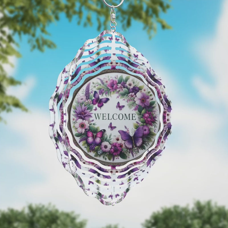 Welcome Purple Butterfly Novelty Metal Wind Spinner WCS-268. 10" Metal Wind Spinner. Made of the highest quality aluminum for a weather-resistant and long-lasting finish. Its lightweight yet durable design makes it perfect for both indoor and outdoor use. Features a dynamic 3D spinning effect that comes to life with the slightest breeze. Pre-drilled holes ensure quick and easy hanging. Add a hook, chain, or string to instantly display your windspinner. Individually shrink-wrapped for protection and proudly made in the USA.
